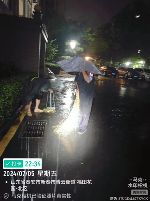 嚴(yán)陣以待巡查到位。7月5日夜間,強(qiáng)降雨持續(xù),物業(yè)公司各項(xiàng)目負(fù)責(zé)人堅(jiān)守崗位,冒雨逆行,反復(fù)對小區(qū)內(nèi)車庫出入口、地下車庫、各排水口等重點(diǎn)部位逐一檢查,徐經(jīng)理親自到各項(xiàng)目(小區(qū))巡查,并對值班人員強(qiáng)調(diào)要隨時(shí)監(jiān)控暴雨動(dòng)態(tài),切實(shí)做好24小時(shí)值守工作。巡查工作一直持續(xù)到6日凌晨,為廣大業(yè)主排除了安全隱患,展現(xiàn)了華通人關(guān)鍵時(shí)刻挺身而出的責(zé)任與擔(dān)當(dāng)。