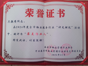 12月17日,在泰安市物業(yè)行業(yè)管理協會第三屆第二次會員代表大會上,華通物業(yè)獲得泰安物協頒發(fā)的2024年度“優(yōu)秀會員企業(yè)”、“優(yōu)秀物業(yè)項目”榮譽,公司經理徐海榮獲“優(yōu)秀物業(yè)服務經理人”,安建、王振濤分別獲得“最美物業(yè)人”稱號。(劉劍)