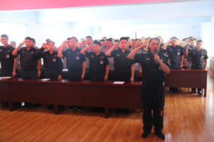 最后,在場(chǎng)全體保安人員面對(duì)黨旗、國(guó)旗就70周年國(guó)慶安保工作進(jìn)行宣誓。堅(jiān)決服從命令、聽(tīng)黨指揮、勇敢擔(dān)當(dāng)、不負(fù)重托、文明執(zhí)勤、嚴(yán)守紀(jì)律、不辱使命、恪盡職守,迎接一切挑戰(zhàn),戰(zhàn)勝一切困難,全力以赴,決戰(zhàn)決勝,堅(jiān)決打贏安保維穩(wěn)攻堅(jiān)戰(zhàn),全力投身建國(guó)七十周年安保任務(wù),為70周年建國(guó)大慶獻(xiàn)禮。(張遷)