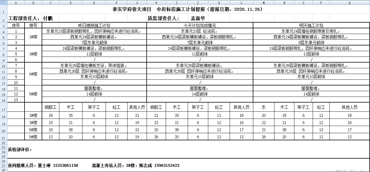 泰安學府春天桃李園工程項目于2019年12月20日開工,計劃竣工日期為2021年9月竣工,截至目前2020年11月27日2#樓主體施工至24層砌體8層;3#樓主體施工至24層砌體12層;6#樓主體施工至26層砌體10層;9#樓屋面施工砌體15層;4棟單體周邊車庫按施工計劃施工中;2#公建對基礎(chǔ)進行挖槽施工。中房建工將層層落實、區(qū)域劃分、穩(wěn)步推進、逐步完成,確保項目按計劃工期順利交付。(王帥)