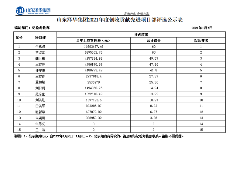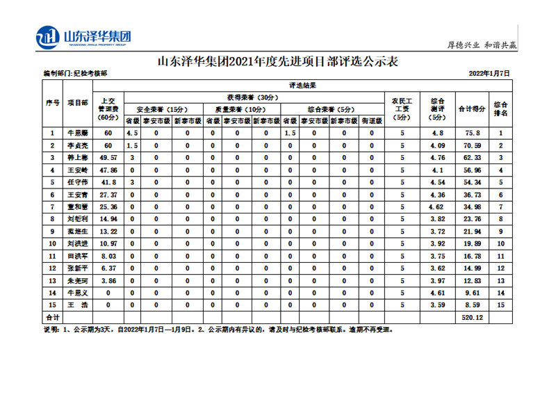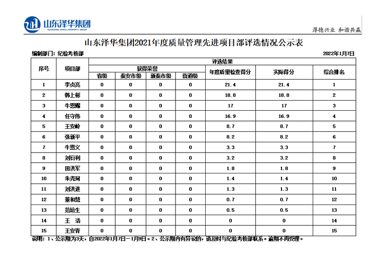 2021年度中房建工各項目部綜合評選公示