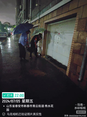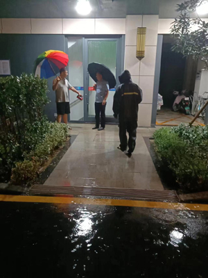 嚴(yán)陣以待巡查到位。7月5日夜間,強(qiáng)降雨持續(xù),物業(yè)公司各項目負(fù)責(zé)人堅守崗位,冒雨逆行,反復(fù)對小區(qū)內(nèi)車庫出入口、地下車庫、各排水口等重點(diǎn)部位逐一檢查,徐經(jīng)理親自到各項目(小區(qū))巡查,并對值班人員強(qiáng)調(diào)要隨時監(jiān)控暴雨動態(tài),切實(shí)做好24小時值守工作。巡查工作一直持續(xù)到6日凌晨,為廣大業(yè)主排除了安全隱患,展現(xiàn)了華通人關(guān)鍵時刻挺身而出的責(zé)任與擔(dān)當(dāng)。