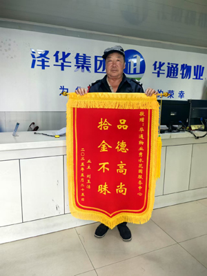 第二天,業(yè)主親自送來一面錦旗,“品德高尚,拾金不昧”的燙金字樣熠熠生輝,保安善舉,彰顯溫暖,感動人心。